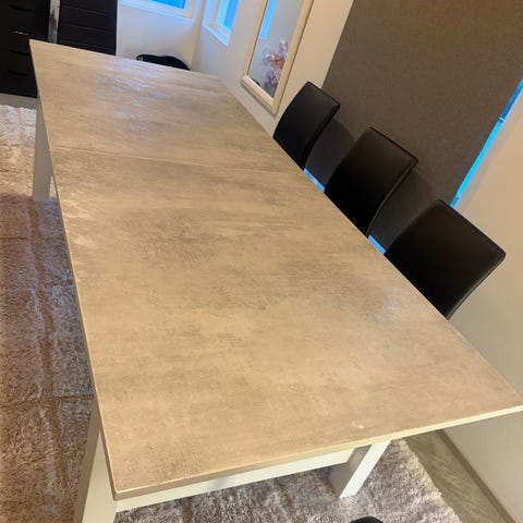 Pitkä ruokapöytä jatkopalalla. Jatkopalan pituus 40cm, joten pöydän leveys ilman jatkopalaa on 140cm. Pöydän pinnalla useita kolhuja (näkyy kuvissa). Vain nouto Helsingistä (Hermanni).