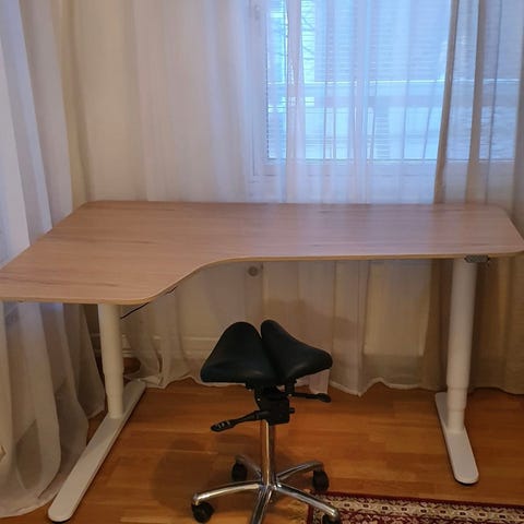 Suuri OffiDuo valkoinen vähän käytetty, tukeva ja siisti kulmasähköpöytä myydään eläköitymisen vuoksi tarpeettomana. Mittatilauksena sovitettu 1965 valmistuneen asuntoni olohuoneen nurkkaan. Kaupan lisänä voin antaa toimivat, siistit ja hyväkuntoiset kangaspäällysteisen satulatuolin+ parkettia suojaavan läpinäkyvän Standart lattiasuojan 120x150 cm ja HumanTool seisontapehmusteen 64x46 cm.