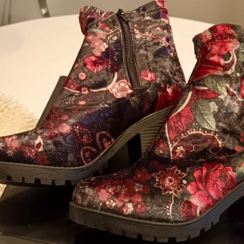 Kukkakuvioiset Duffyn kengät. Pintamateriaali ihanaa pehmeää kuosia. Kengän korko 6 cm. Yhden kerran käytetty.