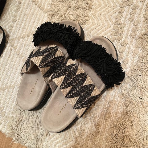 Muutaman kerran pidetyt laadukkaat inuikii merkkiset mustat sandaalit Timantit edessä.(Ovh 230€)
