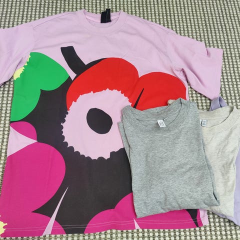Kuvannäköiset vaatteet, mukana uutta ja käytettyä ja käytetyt pesty. Nukkaa ja värikulumaa voi olla. Mukana Marimekon käyttämätön laukku. Vaatteet ja laukku voi olla ryppyisiä säilytyksestä. Myyn vain pakettina. Nouto tai posti. En tee toridiiliä. Savuton ja eläimetön koti.