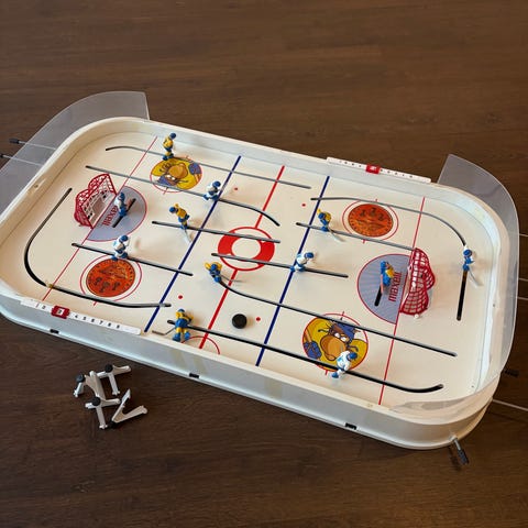 Erinomaisessa kunnossa oleva pöytäjääkiekkopeli. Mukana tulee kuvan mukaisesti kaksi kiekkoa ja varaosat pelin käsikahvoihin.