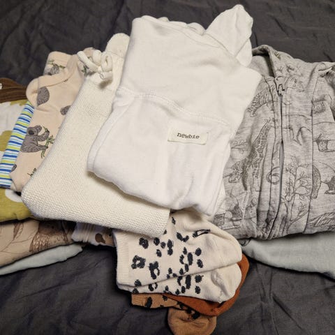 Myydään tyttöjen vaatepaketti, jossa kokoja vastasyntyneestä kokoon 60. Vaatteet unohtuivat pussukkaan odottamaan pesua valkaisuaineella, joten tahroja niistä löytyy. Mukana pipa, vaaleansininen kietaisupaita, violetti body (olan toinen neppari rikki), viisi valkoista kietaisubodyä (kolmessa pellen kuva) ja vaaleanpunasävyinen mekko. Yhdestä pellebodystä puuttuu sitomisnauha. Toivottavasti jollain on hieman intoa pestä ja fiksailla näitä vaatteita, jotta ei tarvitsisi heittää pois. Toki kakkosvaatteina menevät näinkin. Suurimmassa osassa vaatteista on käännettävät hihansuut, jotka estävät pikkuista käyttäjää raapimasta itseään.
