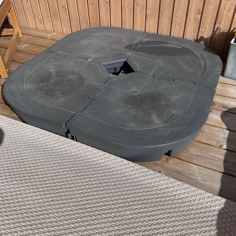 Myynnissä uusi, täysin käyttämätön aurinkovarjon jalka. Muovia, täytetään hiekalla.