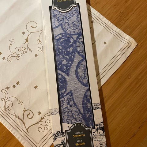 139 cm x 45 cm mittainen kaitaliina (miksei laudeliinakin) ja 43 cm x 45 cm käsipyyhe, pellavaa Jukka Rintalan suunnittelemat. Uudet. Yhteishinta.