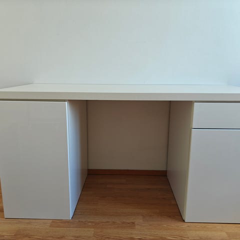 Kaappi, jossa avattava työpöytätaso. Enemmän ja vähemmän fiksailtu, kuitenkin käytössä kestänyt. Lapsi vetänyt erkkaa yhden jalan ympärille, sitä en ole edes yrittänyt poistaa.