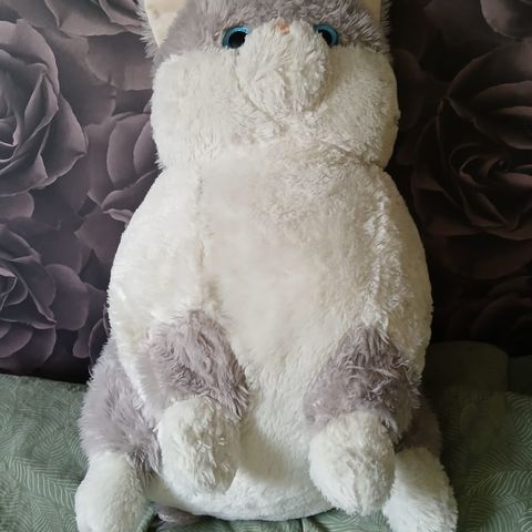 Valkoinen noin 30 cm korkea kissapehmo. Pehmoinen turkki.