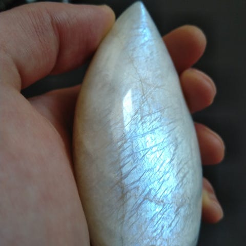 Ostin joukon entisiä Somsolan korukiviä huutokaupasta. Tässä on yksi sateenkaari kuukivenä ostettu kivi, jossa taitaa näkyä ainoastaan sinistä, joten kuukivi saattaa sopia paremmin nimeksi.