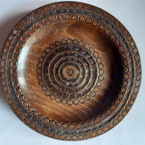 Aikoinaan Tikmarista ostettu puinen koristelautanen, pöydälle tai seinälle. Pölyinen, mutta ehjät. Halkaisija 32 cm. Vain nouto. Hinta 3 euroa.