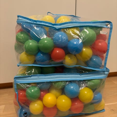 2 pussia eri värisiä pallomeripalloja. Molemmissa säilytyspusseissa on reikä. Pallot ovat ehjiä.