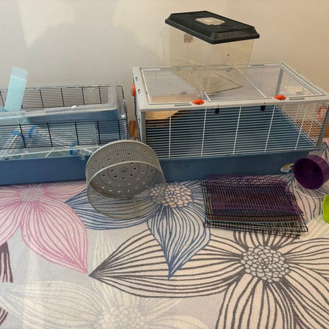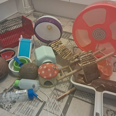 Hyvä kunto,pesty!Vuoden vanha jyrsijän häkki.Sisältää;puinen juoksupyörä.3 pulloa.keraaminen kuppi.kylpyhiekka.heinäkenkä ja heinä putkilo sekä pesä.Kuvat mukana!