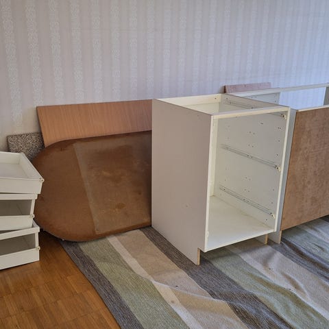 Puretusta keittiöstä ja kylppäristä ylijääneet Puustellin kaapit. Pyökkimelamiinipinta, täyspuiset ovet, kaikissa Puustellin vetimet ja saranat. Listat täyspuisia tai puupuristetta.