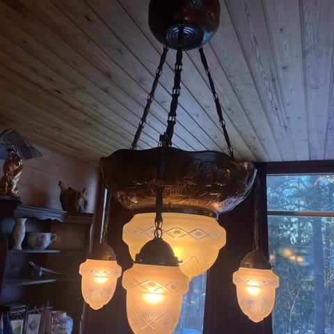 Upea toimiva kattolamppu. Messingissä kaunis patina. Muutama kuhmu kuvussa kuva 12.