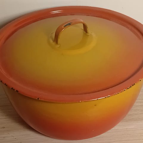 Keltaoranssisia emaliasioita mm.Wärtsilä