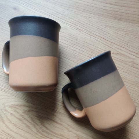 Kuvan ruskeat lasiset kahvikupit ja lautaset. Kuppeja on seitsemän ja lautasia kuusi.