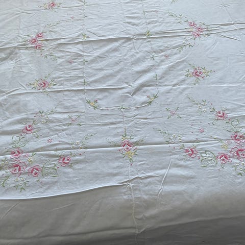 Ihana metrin kokoinen unelman kevyt pöytäliina, kullanvärinen. Tätä ehkä kerran käytetty joulupöydän kattauksessa, mutta näyttää uudelta. Kulmissa pienet koristehelmet tms.