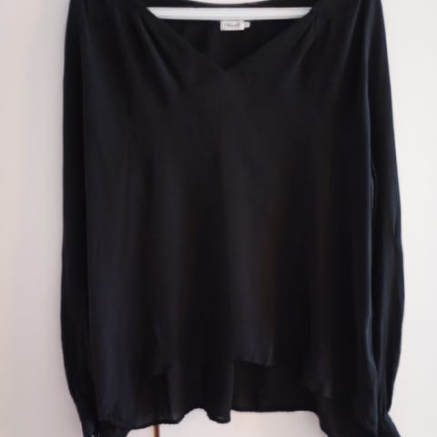 Ohut silkkipusero. Muutoin moitteettomassa kunnossa, mutta toisessa kuvassa näkyy heikosti erottuva tahra. Tämä huomioitu hinnassa. Hinta 35 euroa.
