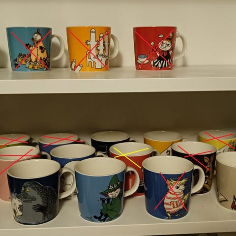 Myynnissä omina ilmoituksinaan muutama muumimuki, muumi lautanen ja kulho, Iltapurjehdus 2010, Seikkailu Muutto muki, kulho ja lautanen, Stockmann 2012, Muumipappa tuumiskelee 1999–2013, Viljonkka / Vilijonkka beige 2004-2013, Rantaelämää 2008, Delfiinisukellus 2007, Siesta 2009, Juhannus 2016 muki ja lautanen, Muumimamma aprikoosi 2014-2020, Muumilaakso 2017, Rannikkomme 2016, Hento lumisade 2018, Primadonnan hevonen 2012, Niiskuneiti ja Runoilija 2013, Kesäteatteri 2017, Lumilyhty 2007, Talvinuotio 2008, Jouluyllätys 2009, Kuusen alla 2013, Hiihtäen kera Herra Virkkunen 2014, Perhe 2004–2010, Koti 2025