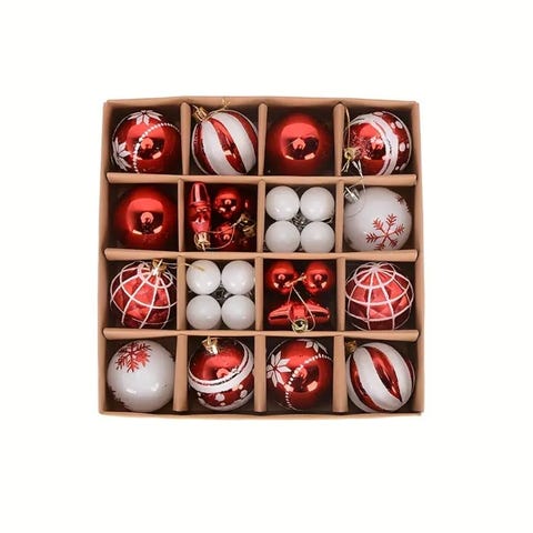 Punaiset koristeelliset joulupallot ja pieni jouluinen Nooan arkki taulu