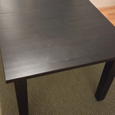 Ikean jatkettava ruokapöytä ylimääräisenä. Pituus 143 cm ja jatkopalalla 203 cm. Leveys 90 cm ja korkeus 75 cm. Ikää löytyy, mutta pidetty hyvässä kunnossa. Ei narise tai notku. Kuvasta näkee vähän miten tuo kansi on tummunut verrattuna tohon jatkopalaan.