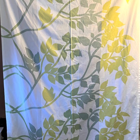 Verhot on keskeltä auringon haalistamat, muutoin hyvässä kunnossa. Ylä- ja alaosaa voi käyttää kankaana esim. tyynynpäällisen tekoon. Verhot on aikoinaan ommeltu Marimekon liikkeessä. Myydään molemmat kerralla.