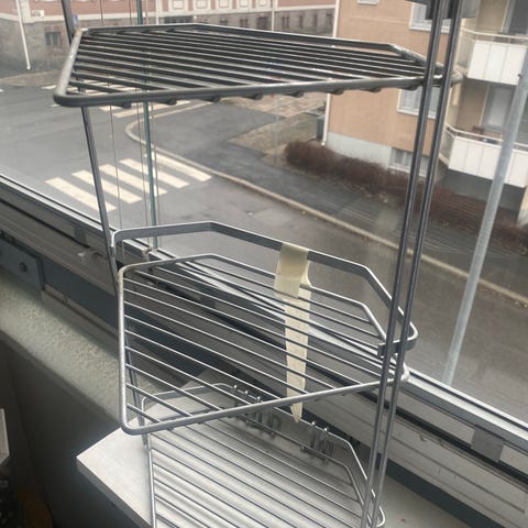 Lasihylly tai taso esim. kylppäriin tai vessaan, 12 cm x 50 cm. Kiinnitys kahdella ruuvilla, jotka jäävät piiloon pyöreän metallilaipan alle. Voin lähettää postissakin.