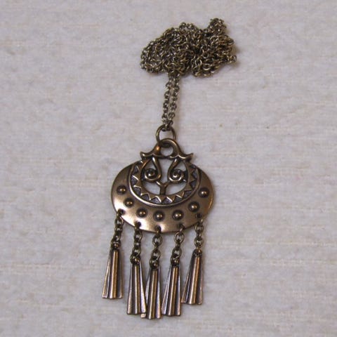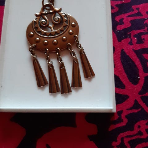 Kalevala Korun pronssinen Kuutar-kaulakoru, 70 cm ketjulla. Riipuksen korkeus 11 cm, leveys n. 5 cm.