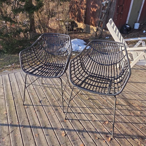 3 ihanaa puutarhatuolia vanhaan pihaan. Tukevat, mutta kuvan mukaisesti puuosat vaatii korjausta. Puuosat helppo uusia vaikka kokonaan, ovat ruuveilla kiinni.