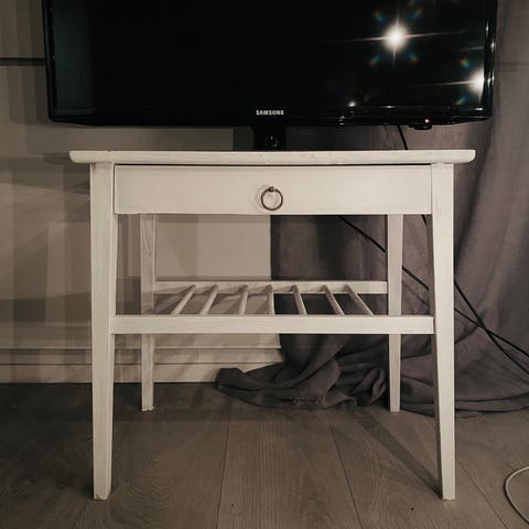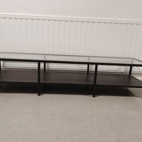 Täyspuinen sivupöytä tai tv-taso, jossa alataso/hylly. Tukeva ja painava. Toimii myös penkkinä. Tehty mäntyliimalevystä ja käsitelty ruskealla kalustelakalla. Toisella sivulla kulmissa kulmaraudat (näkyvät kuvissa).