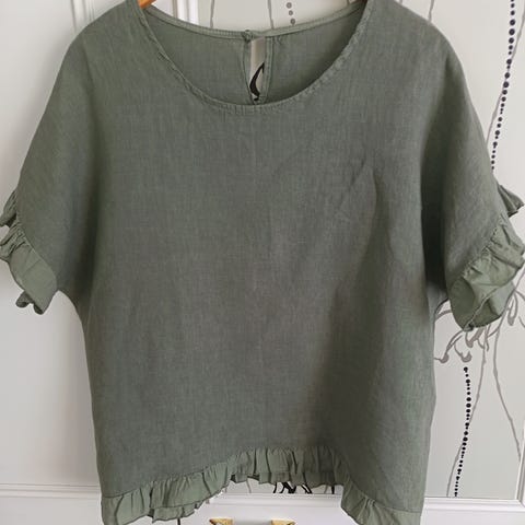 Hyvässä kunnossa oleva pellavapaita, paitapusero. Väri on haalistuneen sininen, lähes harmaa.