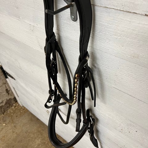 9.Suitset kultaisilla yksityiskohdilla. Poskihihnan mitta lenkistä kuolainlenkkiin 29cm. Säätövaraa paljon. Koko cob/pieni full. 25€