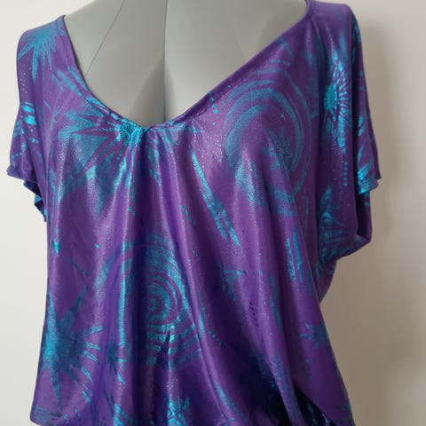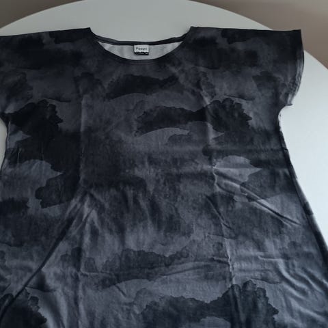 Materiaali 77% puuvillaa, 23% viskoosia, ihanan kevyt materiaali. Pituus 77 cm, kainalokainalo 65 cm ja hiha olkapäästä 62 cm. Joustava nauhakiinnitys vyötäröllä.