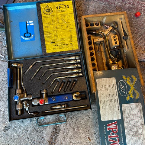 Mittarit, suuttimet ym tarviketta puu laatikossa 3 kpl polttimia
