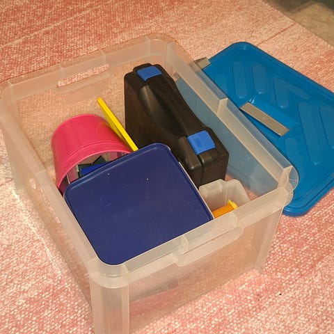 Tupperwaren vanhempi lokerolaatikko harrastustarvikkeille tai muulle pikkutavaralle. Kannessa kulumanaarmuja reilusti. Koko kannen päältä mitattuna 23,5 x 17,5 x 9cm.