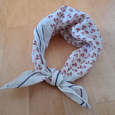 Myydään puuvillakaulahuivi. Huivi on kudottu hyvin kapealla kangaspuulla.