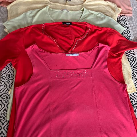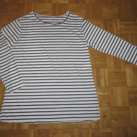 Valkosininen paita. Kokolapussa merkintä M mutta en suosittele M-kokoiselle. Ilmeisesti tarkoitettu väljäksi oversize-paidaksi. Sopii n. XL/XXL-kokoiselle (?) -> tarkista mitat. Kai-kai 82cm, pituus 76cm.