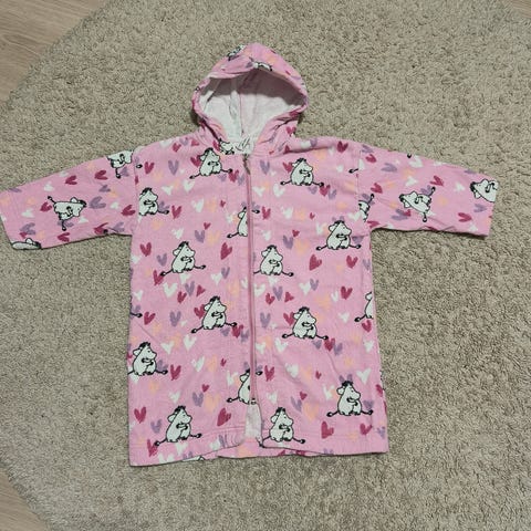 Muumi-kylpytakki 98/104. Kunto ihan hyvä, mutta henkari katkennut. Valmistaja Finlayson. Pesty hajusteettomalla.