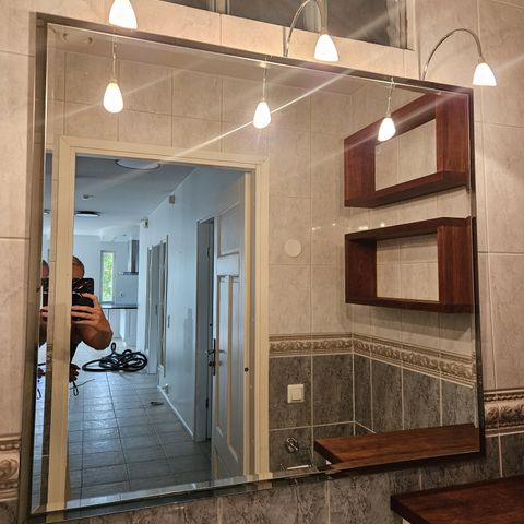 Vessan kalusteet jotka on kasattu mutta ei ole koskaan olleet käytössä. Peili, hylly ja pieni kaappi