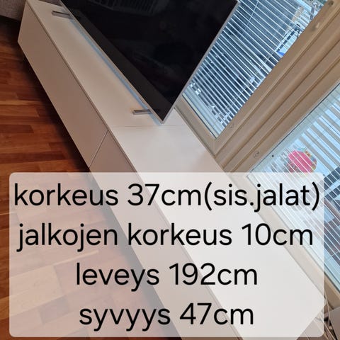 Lundian syvä tv-taso maitolasiovilla. Takana ristikko eli avoin takaa (johtoja helppo kuljettaa). Valkoinen, tason pinnassa muutamia pieniä kulumisjälkiä.