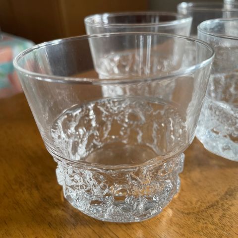 Design Tapio Wirkkala. Korkeus 11 cm halkaisija 8 cm. Nämä lasit ovat tunnettuja ainutlaatuisesta muotoilustaan, jossa on jäätynyttä vettä muistuttava kuviointi. Ne sopivat erinomaisesti arkeen ja juhlaan, tuoden tyylikkyyttä kattaukseen. Lasit ovat kestäviä ja laadukkaita, mikä tekee niistä pitkäikäisiä käyttöesineitä. Yhteishinta 4 kpl.