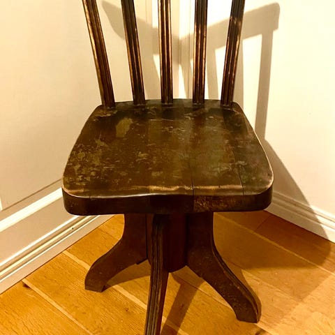 Billnäs konttorituoli, kissan raatelema selkänoja.