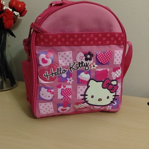 Kuvannäköinen joskus käytössä ollut Hello kitty laukku. Laukussa on jonkin verran jälkeä, mutta vielä käyttökelpoinen. Nouto tai posti. En tee toridiiliä.