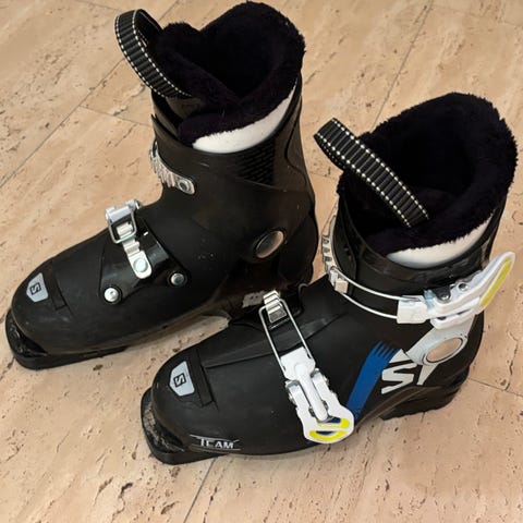 Salomonin lasten laskettelumonot, koko 255 - 21/21.5, vastaa kengän kokoa 34-35. Kunto hyvä, laskupäivien jälkeen sisäkengät ja pohjalliset kuivattu aina kunnolla. Nouto Uittamo.