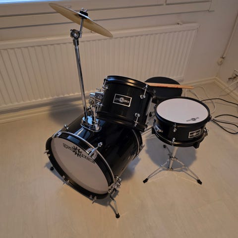 Mukana myös istuin ja 2 paria rumpukapuloita