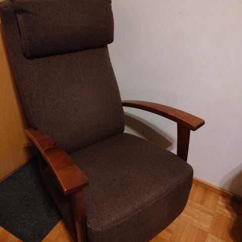 Kirsi Valantin suunnittelema Hymy-tuoli, johon on vaihdettu päällinen verhoomossa v. 2020.
