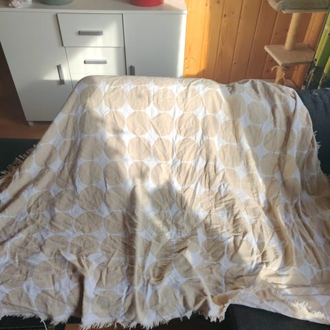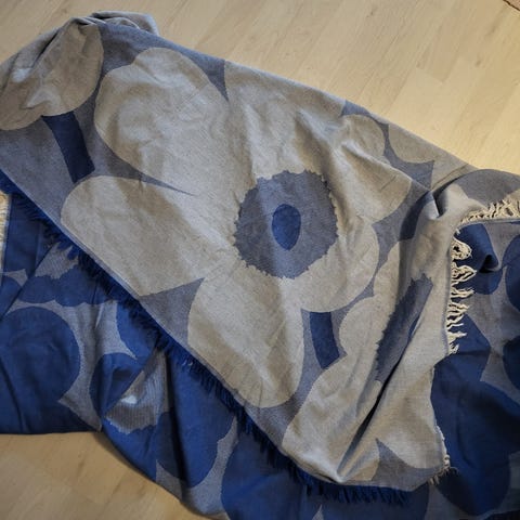 Kesäkotiin uusi Marimekon torkkupeitto, puuvillaa. 1. Kuvassa kukan keskus näyttää keltaiselta. Oikeasti on vihreä. Liikun alueella Lahti-Heinola-Mikkeli-Savonlinna-Parikkala tai voin myös lähettää Toridiilillä tai ilman