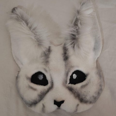 Maski on itse tehty ja ei käytetty. Maski on kestävä ja pysyy hyvin päässä. Korvat ovat taitettavat.