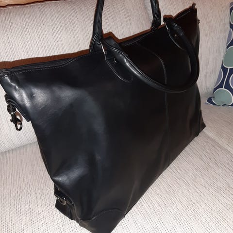 Täysin käyttämätön musta olkalaukku, beigen ja harmaan värinen alaosa.