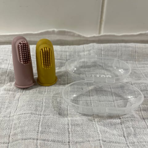 Uusi suojakotelossa silikooni hammasharja. Kotelo on käytety, mutta kiehuvassa vedessä pesty ennen uuden sisään laittamista.