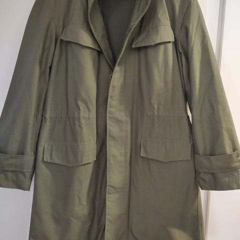 Lyhyt oliivinvihreä takki. Vyötäröllä kiristysnyöri, sisätasku, napitus. Puuvillaa.